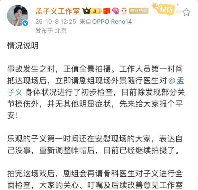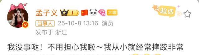 随后孟子义也是更新了动态,安慰粉丝们,说自己从小就经常摔跤,很皮实的,目前她已经在拍摄中了,让大家别担心了!