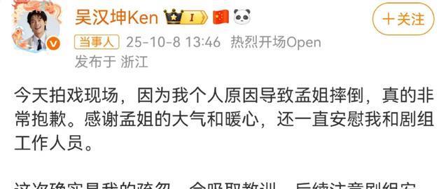 不小心踩到她裙子的吴汉坤,也是发文向孟子义道歉,感谢孟子义大气暖心,还一直在安慰他和剧组的工作人员!