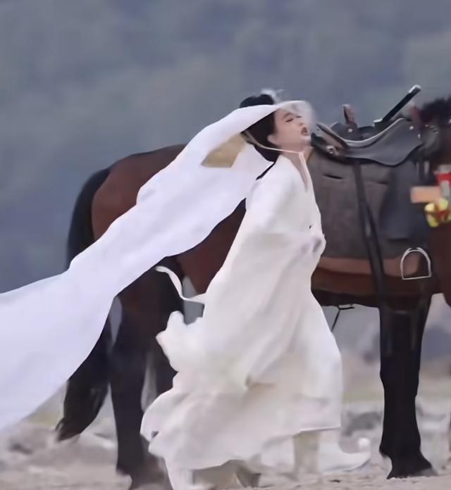 孟子义穿着一袭白裙,头戴白色纱幔,帽子上还有白色的拖尾,看起来仙气飘飘。随着戏份拍摄,孟子义往前跑去。