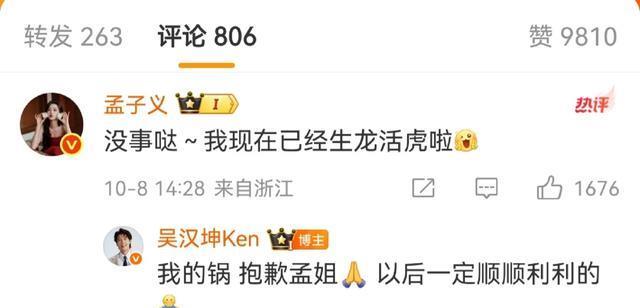 孟子义也给吴汉坤评论,让他不要再愧疚了,目前的她已经生龙活虎了!